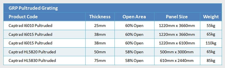 Pultruded Panel Sizes are available in 25mm, 38mm & 50mm (1220 x 3660)